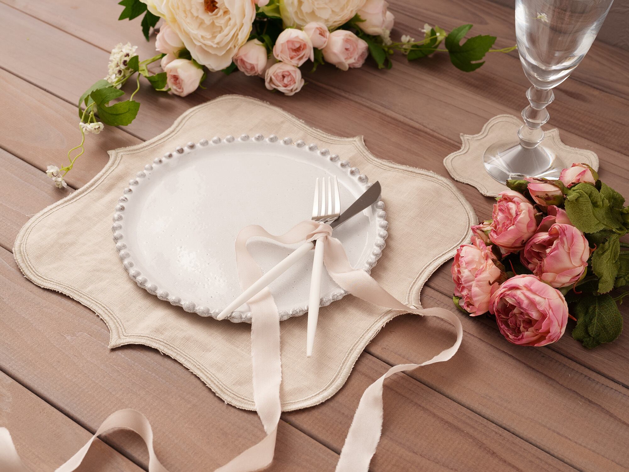 エレガントなシルエットで刺繍の縁取りを施したティーマットです。
