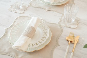 刺繍で縁取りされたこちらのテーブルリネンは、置くだけで食卓が華やかになるデザイン。